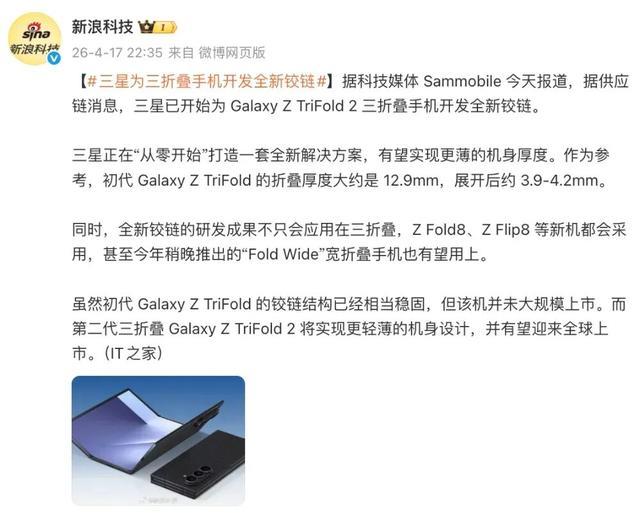 同时,全新铰链的研发成果不只会应用在三折叠,Z Fold8、Z Flip8 等新机都会采用,甚至今年稍晚推出的“Fold Wide”宽折叠手机也有望用上。