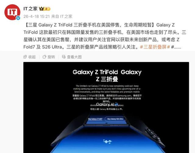 Galaxy Z TriFold 这款最初只在韩国限量发售的三折叠手机,在美国市场也走到了尽头。三星确认其在美国已售罄,并建议用户关注官网以获取未来创新产品,或考虑 Z Fold7 及 S26 Ultra。